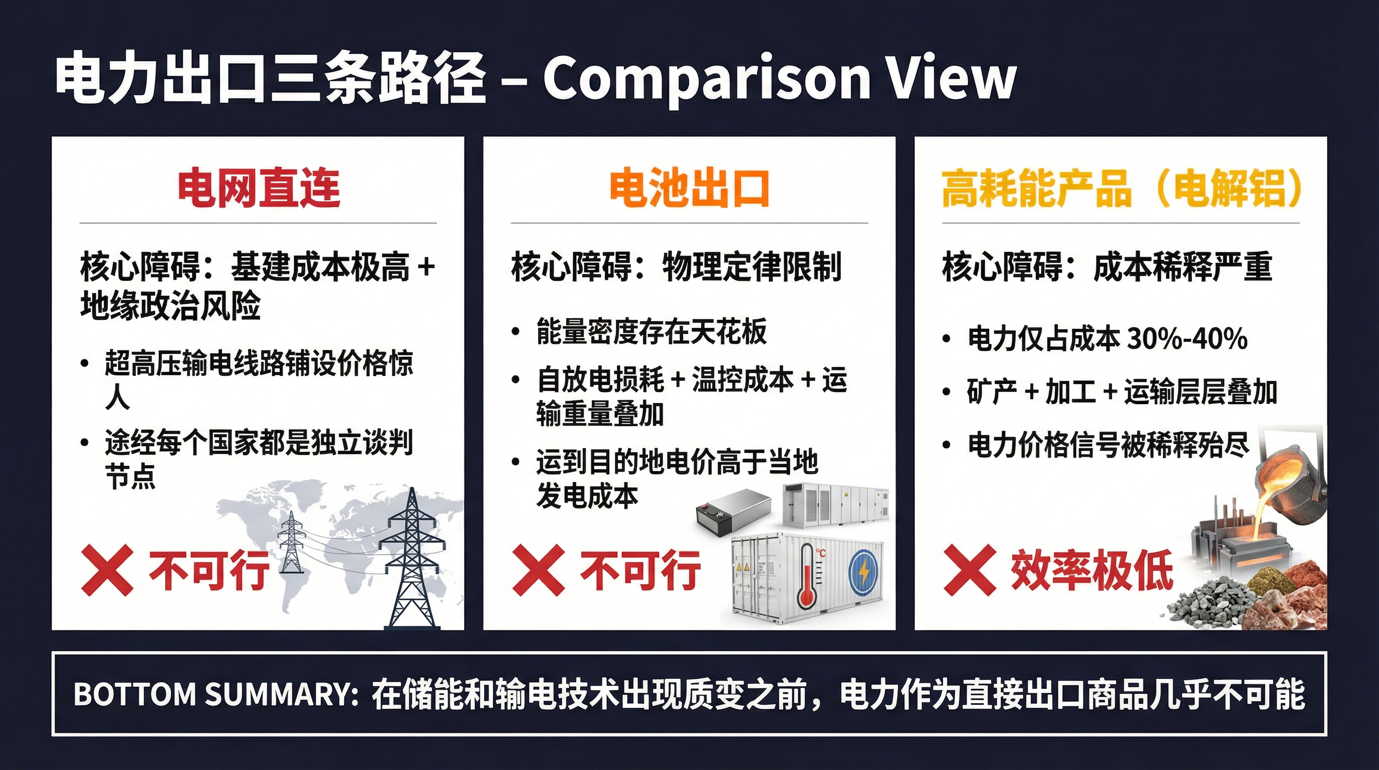还有一条间接路径:通过高耗能产品(电解铝、工业硅)出口电力。但这些产品的成本结构中电力仅占 30%-40%,矿产、加工、运输层层叠加,电力的价格信号被稀释得很薄。和石油"一桶就是一桶"的清晰定价相比,电解铝作为电力载体的纯度太低。