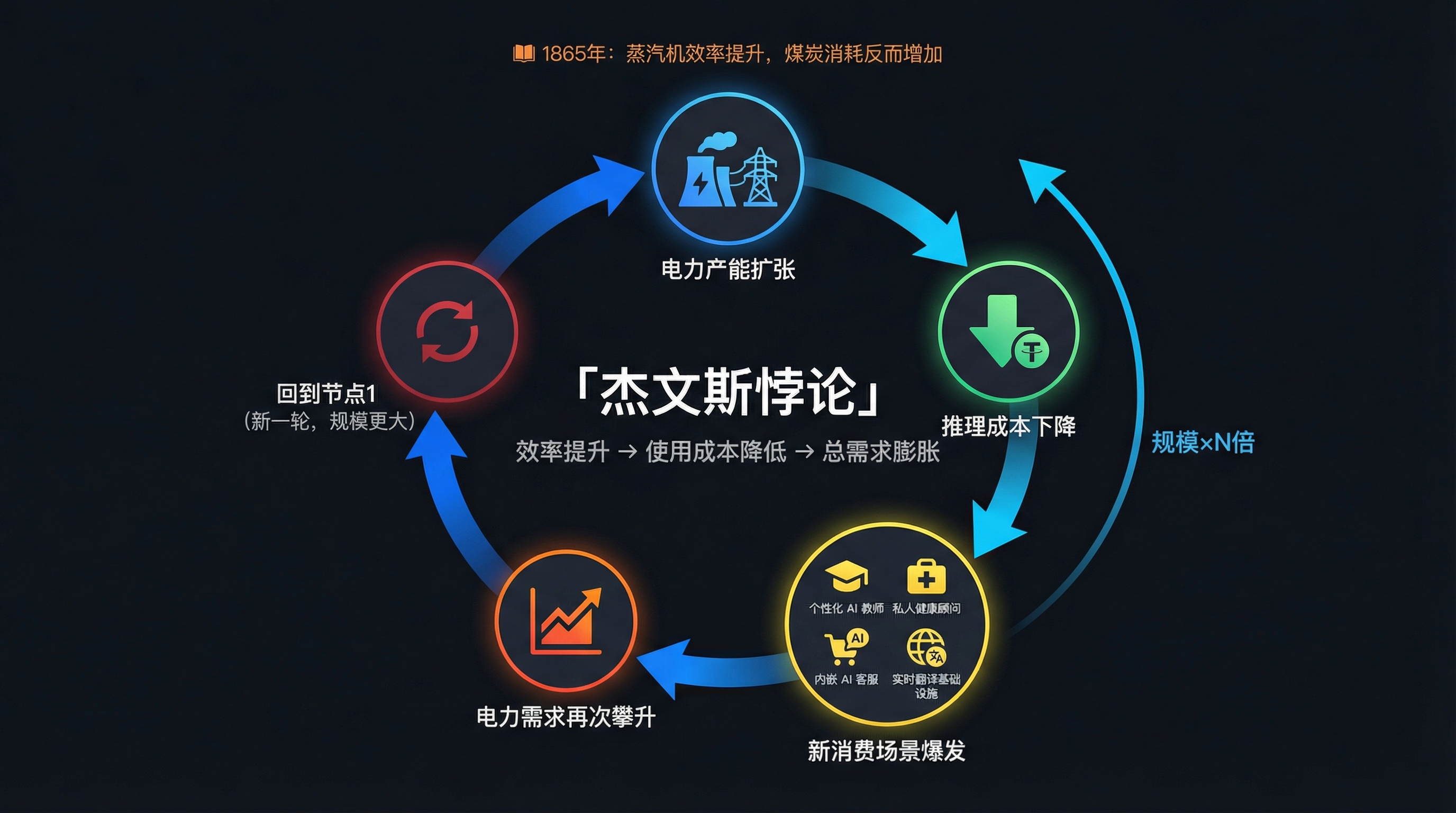 如果杰文斯悖论成立,AI 领域会进入一个更大尺度的螺旋循环:电力产能扩张 → 推理成本下降 → 新消费场景爆发 → 电力需求再次攀升 → 新一轮产能扩张。 每一轮螺旋中,Token 作为电力变现单位的角色都被进一步强化。