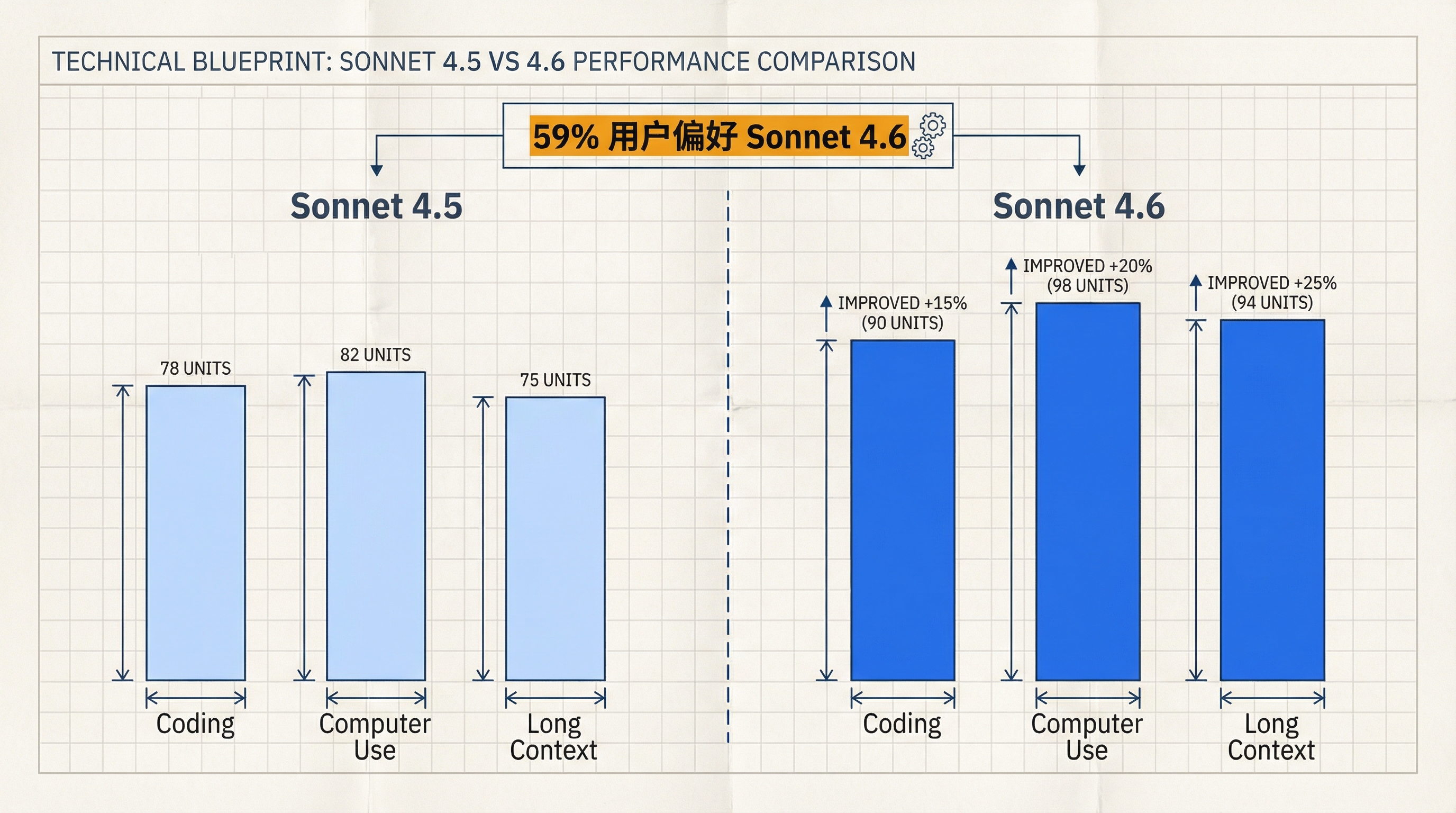 Claude Code 的早期测试给出了一个让人意外的数字:用户在 59% 的情况下更偏好 Sonnet 4.6,而不是 2025 年 11 月发布的旗舰模型 Opus 4.5。理由也不是"差不多就行"的妥协,而是 Sonnet 4.6 在具体维度上做得更好——更少的过度工程、更少的虚假成功声明、更好的指令遵循和多步骤任务的完成一致性。