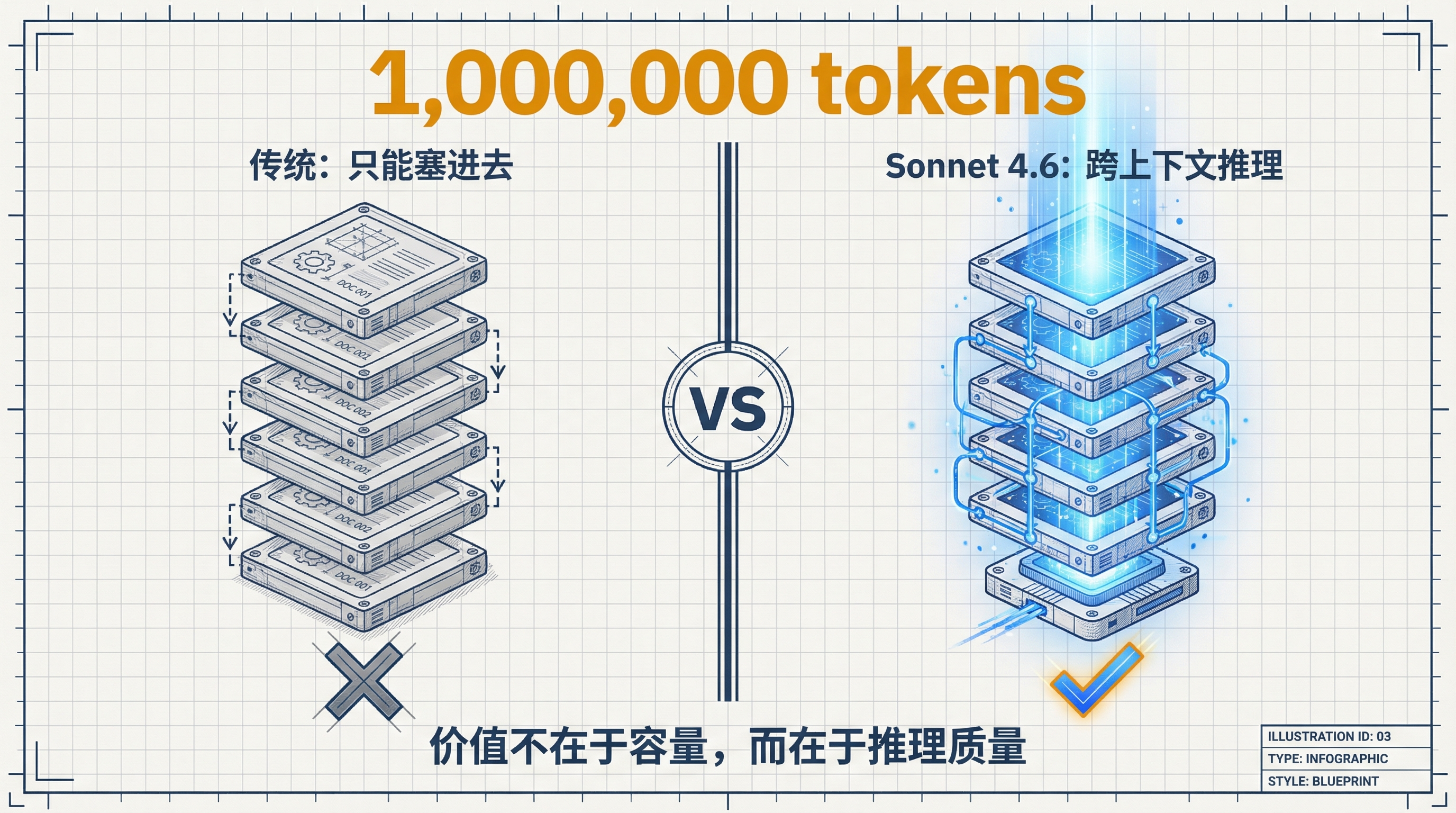 Sonnet 4.6 的上下文窗口扩展到 100 万 token(beta),这个数字本身不新鲜——竞品也有类似规格。关键在于 Anthropic 强调的是"在整个上下文中有效推理",而不只是"能塞进去"。