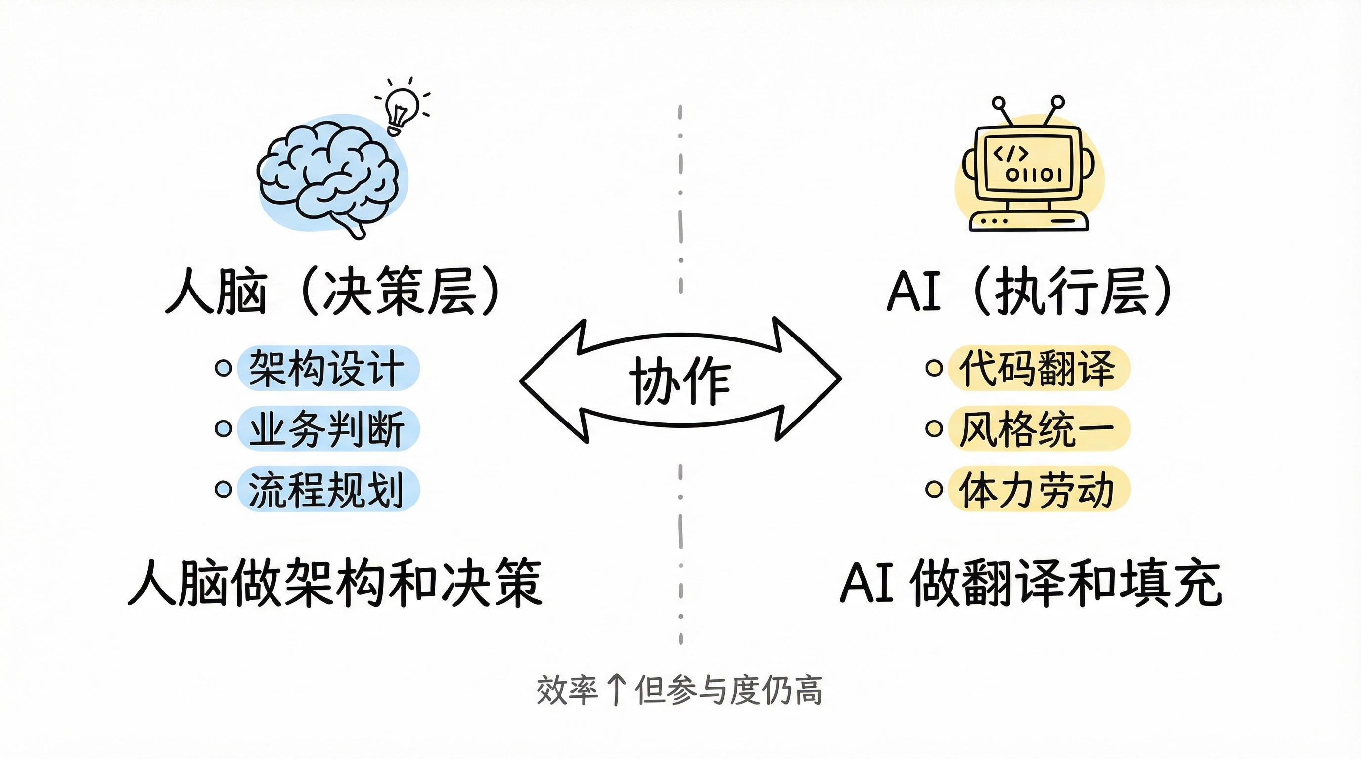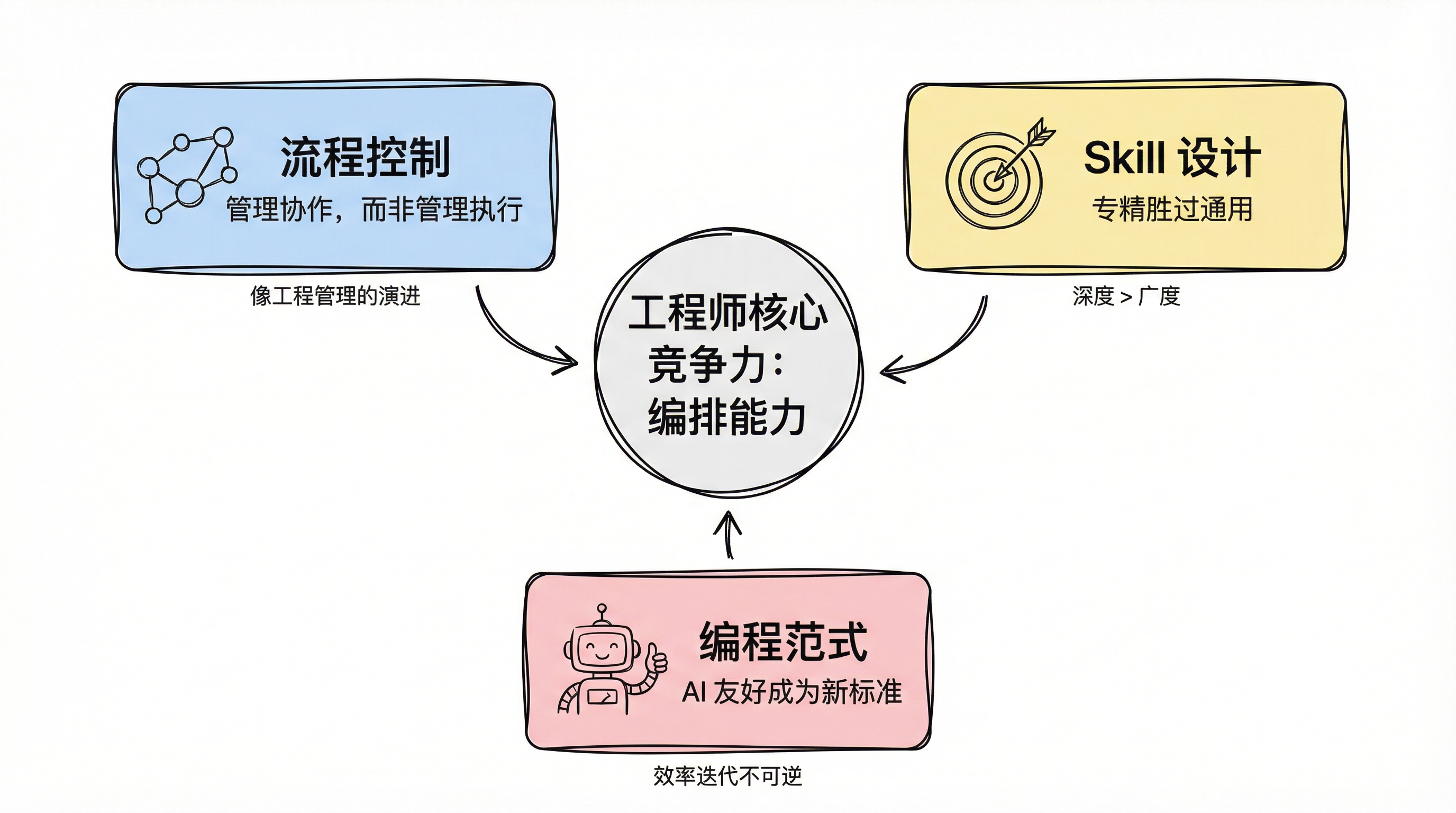 The only certainty is the direction: an engineer's value is migrating from "implementation capability" to "orchestration capability." Writing code won't disappear, but its share of an engineer's workload will keep declining. What's replacing it is deep business understanding, agent workflow design, and the ability to convert tacit knowledge into executable Skills.