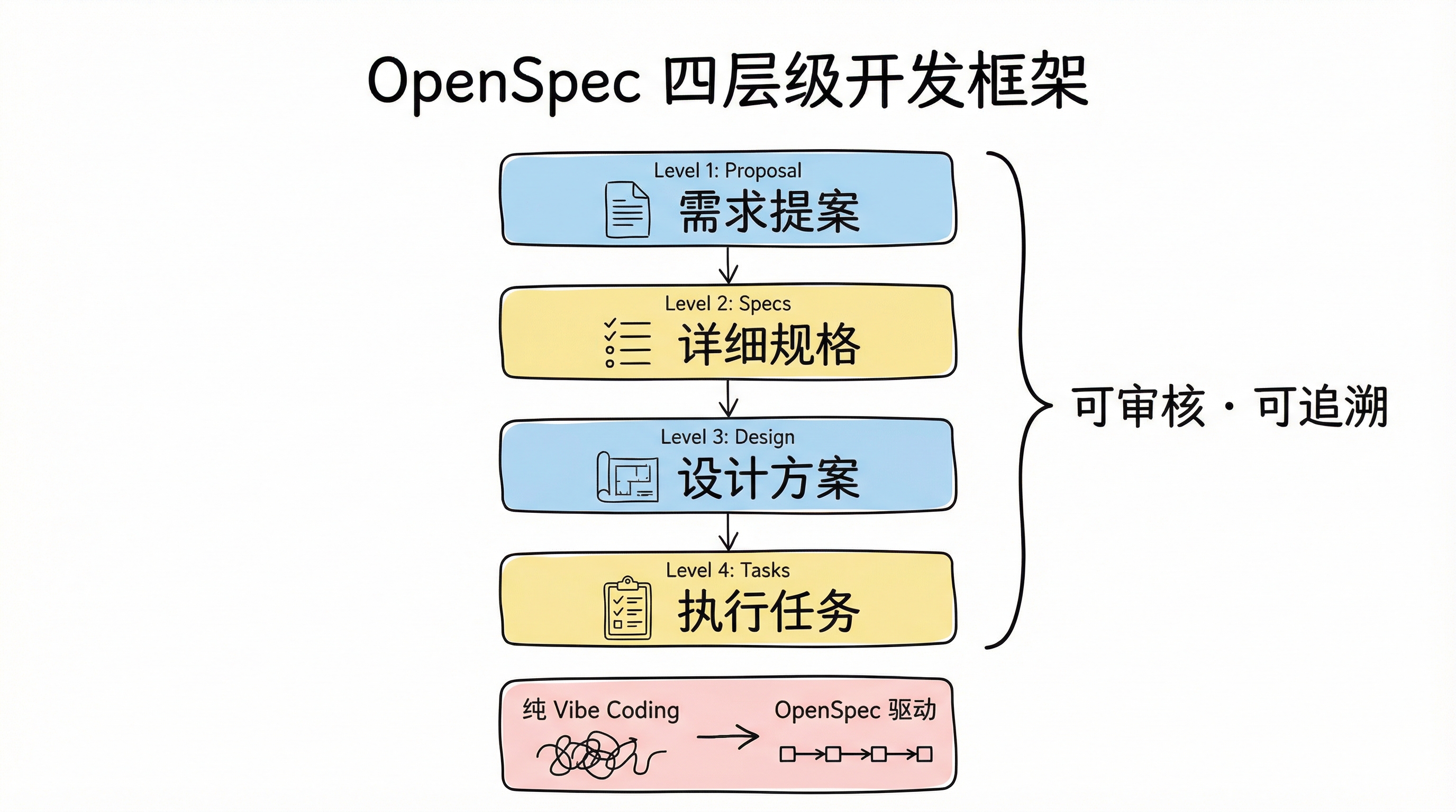 This phase introduced OpenSpec — a spec-driven development framework. The problem with pure vibe coding is that the process becomes opaque: agents lose task context across multiple conversation turns, and there's no way to trace why a particular decision was made. OpenSpec structures requirements into four layers — proposal, specs, design, and tasks — making the entire development process auditable and traceable. The core problem it solves isn't whether AI can write code, but whether the code AI writes follows the agreed-upon specifications.