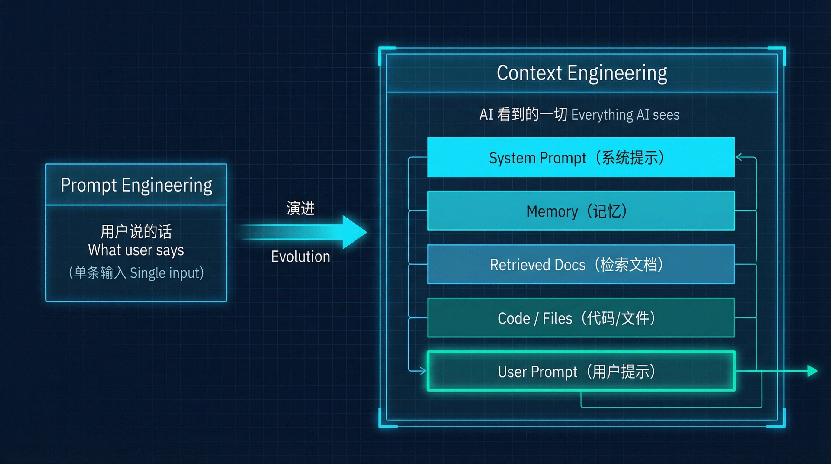 The turning point came when I started using Claude Code on real projects. I once crafted an extremely detailed prompt — clear requirements, reference examples, explicit constraints. The output was still mediocre. After a long debugging session, I found the issue: the model was missing the project's tech stack, didn't know our framework, had no sense of existing code style, and was completely blind to the business context.